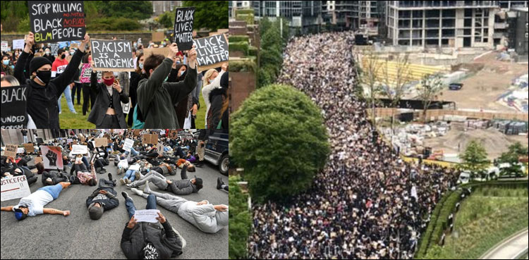 برطانوی نشریاتی ادارے کی رپورٹ کے مطابق مظاہرین نے ہاتھوں میں پلے کارڈز اٹھا رکھے تھے جس پر ’نسل پرستی ایک وبا ہے‘ جیسے نعرے درج تھے۔
