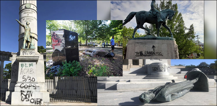 جنرل رابرٹ ای لی، اسٹون وال جیکسن، جیفرسن ڈیوس اور جنرل جے ای بی اسٹورٹ ین رچمونڈ کی یاد میں لگائے گئے مجمسوں کو مظاہرین نے چاکنگ سے بھر دیا ہے جبکہ ریاست الاباما اور برمنگھم میں مظاہرین نے رسیوں اور ٹرک کی مدد سے چارلس لینن کے مجسمے کو زمین بوس کردیا ہے۔