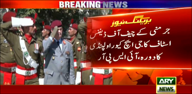 پاک فوج کے شعبہ تعلقاتِ عامہ (آئی ایس پی آر) کی جانب سے جاری ہونے والے اعلامیے کے مطابق جرمنی کےچیف آف ڈیفنس اسٹاف نے جنرل ہیڈ کوارٹر (جی ایچ کیو) کا دورہ کیا۔