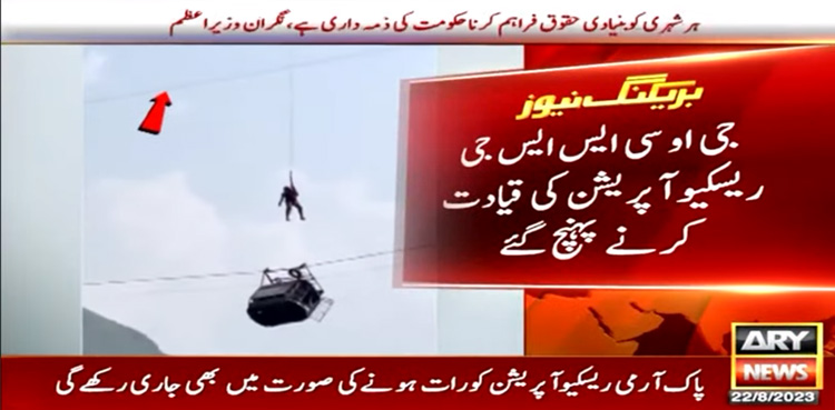 اے آر وائی نیوز کے مطابق جی او سی ایس ایس چیئر لفٹ میں پھنسے لوگوں کے لیے ہونے والے آرمی ریسکیو آپریشن کی قیادت خود کر رہے ہیں، ہیلی کاپٹر سے سلنگ ریسکیو آپشن کے علاوہ باقی آپشنز بھی دیکھےجا رہے ہیں، ہیلی کاپٹر کے قریب جانے سے لفٹ ہلنا شروع ہو جاتی ہے۔