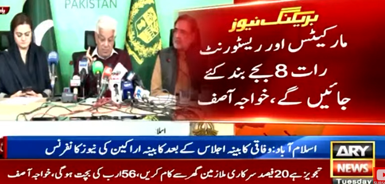 خواجہ آصف نے کہا کہ دنیا بھر میں ساڑھے 6 یا ساڑھے 7 بجے تک مارکیٹیں بند ہو جاتی ہیں۔ پاکستان واحد ملک ہے جہاں رات 12 بجے تک دکانیں کھلی رہتی ہیں۔ کفایت شعاری پالیسی اپنا کر دن کی روشنی سے استفادہ کیا جائیگا۔ ہم کہہ رہے ہیں کہ اپنی عادتیں نارمل کرلیں۔