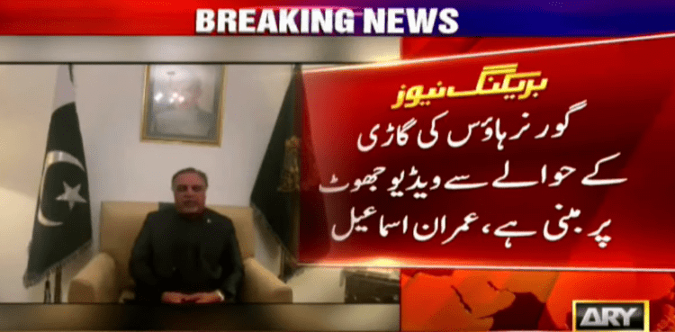 تفصیلات کے مطابق گورنر سندھ عمران اسماعیل نے گورنر ہاؤس کی گاڑی کی ویڈیو وائرل ہونے کے حوالے سے اپنے بیان میں کہا کہ آج گورنرہاؤس کی گاڑی کی ایک ویڈیووائرل ہوئی، گورنرہاؤس کی گاڑی کے حوالے سے ویڈیو جھوٹ پرمبنی ہے۔