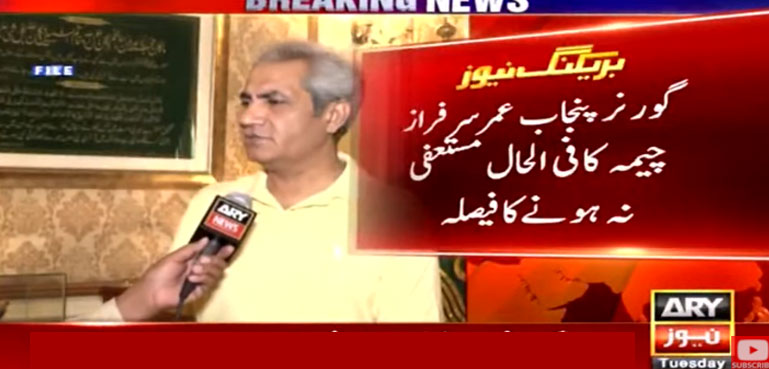 گورنر پنجاب عمر سرفراز چیمہ نے اے آر وائی نیوز سے گفتگو کرتے ہوئے کہا کہ انہوں نے فی الحال گورنر پنجاب کے عہدے سے مستعفی نہ ہونے کا فیصلہ کیا ہے اور وزیراعلیٰ پنجاب کے الیکشن کے بعد مستعفی ہونے کا ارادہ رکھتا ہوں۔
