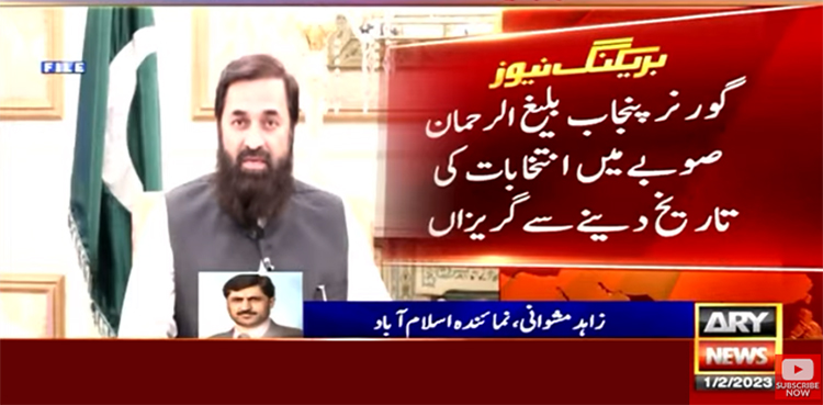 نمائندہ اے آر وائی نیوز کے مطابق گورنر نے الیکشن کمیشن کے خط کا جواب دیتے ہوئے کہا ہے کہ ملک میں معاشی و سیکورٹی حالات سب کے سامنے ہیں پنجاب اسمبلی کی تحلیل قانون کے مطابق ازخودہوئی تھی عام انتخابات کی تاریخ پر الیکشن کمیشن اسٹیک ہولڈرز سے مشاورت کرے۔