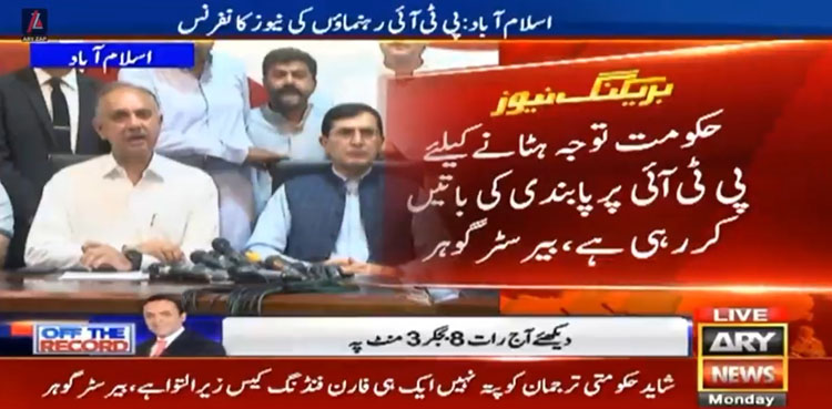 چیئرمین پی ٹی آئی بیرسٹر گوہر خان اور اپوزیشن لیڈر عمرایوب نے پریس کانفرنس کی، اس موقع پر بیرسٹر گوہر کا کہنا تھا کہ حکومتی ترجمان پی ٹی آئی پر فارن فنڈنگ میں پابندی کی بات کر رہے ہیں، شاید حکومتی ترجمان کو پتہ نہیں ایک ہی فارن فنڈنگ کیس زیرالتوا ہے۔