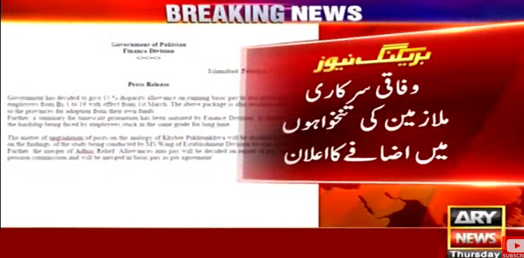 اسلام آباد: حکومت نے کم تنخواہ والے سرکاری ملازمین کی تنخواہ میں اضافے کا اعلان کردیا۔