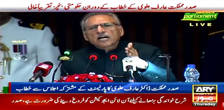 پارلیمنٹ کے مشترکہ اجلاس میں صدر مملکت عارف علوی کا خطاب جاری تھا کہ اس دوران حکومتی اراکین نے شور شرابا کیا، بعدازاں واک آؤٹ کر گئے۔ صدر کے خطاب کے دوران حکومتی بنچز تقریباً خالی ہوگئے۔