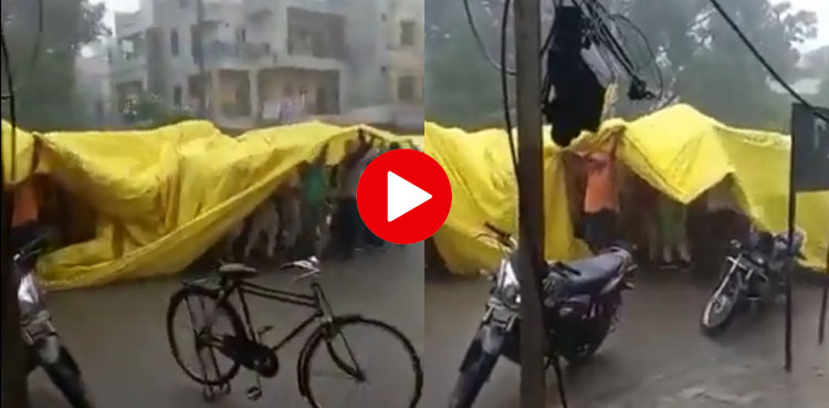 طوفانی بارش سے بچنے کے لیے باراتیوں نے پلاسٹک کی بڑی شیٹ کا استعمال کیا اور اسے اپنے سر پر رکھ کر بارات کو اپنی منزل تک پہنچانے کیلئے سڑک پر چلتے رہے۔