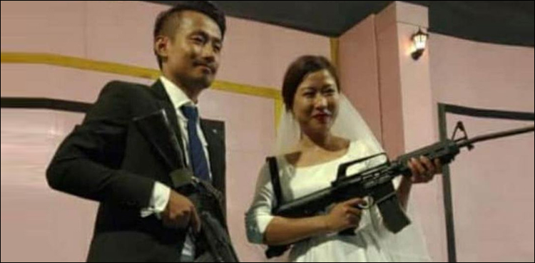 اسی طرح ناگا لینڈ کے شہر دیماپور میں ہفتے کے روز ہونے والی شادی میں دلچسپ مرحلہ اُس وقت آیا کہ جب نیا نویلا جوڑا جدید ہتھیاروں کے ساتھ اسٹیچ پر پہنچا۔ سوشل میڈیا پر وائرل ہونے والی تصاویر میں دیکھا جاسکتا ہے کہ دلہن نے سفید رنگ کا عروسی جوڑا جبکہ دلہا نے تھری پیس زیب تن کیا ہوا تھا۔