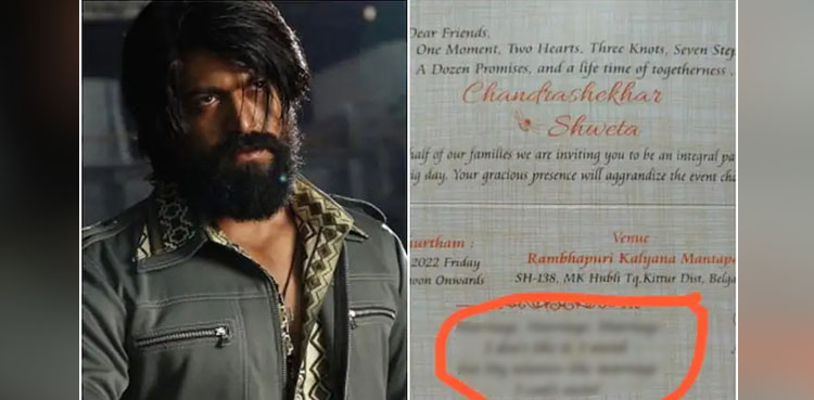 ساؤتھ انڈین فلم کے جی ایف ٹو کے مداح نے شادی کے کارڈ پر فلم کا ڈائیلاگ لکھوا لیا جس کی تصاویر سوشل میڈیا پر وائرل ہوگئیں۔
