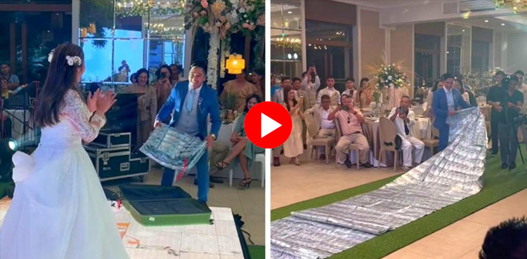 شادی کی تقریب کے دوران دولہا نے اپنی دلہنیا کا استقبال نوٹوں کے تیار کردہ قالین سے کیا۔