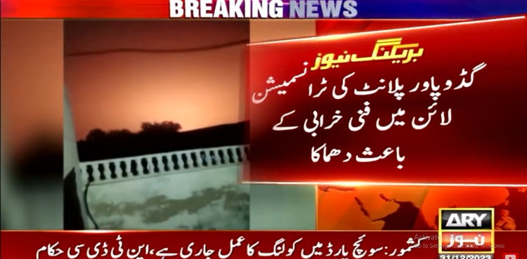 کشمور: گڈو پاور پلانٹ کی ٹرانسمیشن لائن میں فنی خرابی کے باعث دھماکا ہوگیا جس کی وجہ سے سندھ پنجاب اوربلوچستان کے کئی علاقوں کو بجلی کی فراہمی معطل ہوگئی۔