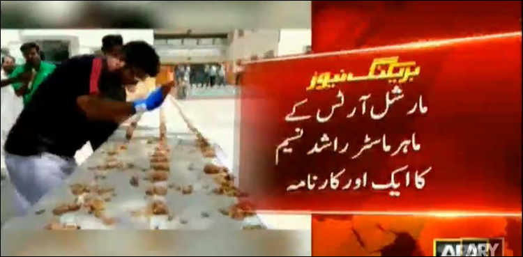 تفصیلات کے مطابق مارشل آرٹس کے پاکستانی ماہر راشد نسیم نے بھارت سے ایک اور عالمی ریکارڈ چھین لیا, ایک منٹ میں ہتھیلی سے دو سو اٹہھتر آخروٹ توڑ ڈالے۔