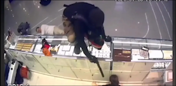 ڈاکو کا معصوم لوگوں کو قتل کرنے کا واقعہ کیمرے میں محفوظ ہوگیا، سی سی ٹی فوٹیج میں دیکھا جاسکتا ہے کہ ایک نقاب پوش شخص پستول کے ہمراہ جیولری شاپ کی جانب آتاہے اور دکاندار پر اور ایک اور شخص پر فائرنگ کرکے کاوٓنٹر کے دوسری جانب جاکر سونے کے زیورات لوٹنے لگتا ہے۔