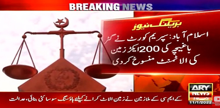 اسلام آباد: سپریم کورٹ نے کے ایم سی ایمپلائز کوآپریٹو سوسائٹی(گٹرباغیچہ) کی زمین کی الاٹمنٹ منسوخ کردی ہے۔