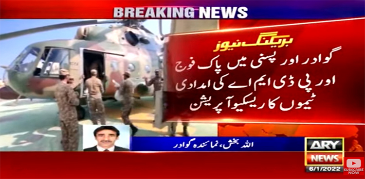 اے آر وائی نیوز کے مطابق پسنی میں بارشوں سے نقصان کا تخمینہ لگانے اور ضلعی انتظامیہ کی مدد کیلئے پاکستان آرمی اور پی ڈی ایم اے کی امدادی ٹیموں کا ریسکیو آپریشن جاری ہے، ریسکیو آپریشن کے لئے آرمی ہیلی کاپٹرز کو استعمال کیا جارہا ہے، جس کا مقصد دور دراز علاقوں کے متاثرین میں جلد از جلد بنیادی ضروریات کو فراہم کرنا ہے۔