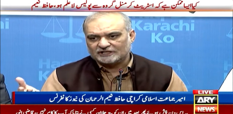حافظ نعیم الرحمان کا کہنا تھا کہ اورنگی میں جماعت اسلامی کے کارکن کو قتل کردیا گیا، دو افراد کو اسٹریٹ کرائم میں قتل کیا گیا، قاتل کھلے عام کارروائیاں کررہے ہیں۔