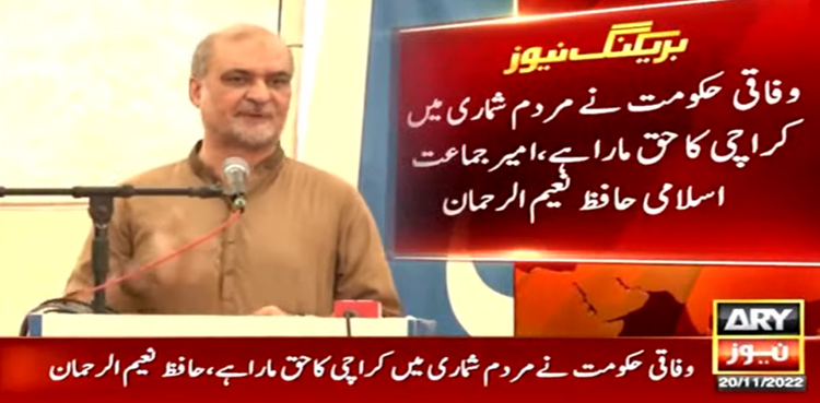 کراچی میں ایک تقریب سے خطاب میں حافظ نعیم الرحمٰن نے کہا کہ وفاقی حکومت نے مردم شماری میں کراچی کا حق مارا ہے، کراچی کا حق ہے کہ ٹرانسپورٹ کا نظام ملے مگر سرکلر ریلوے بند پڑی ہے۔