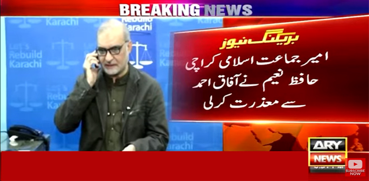 امیر جماعت اسلامی کراچی حافظ نعیم نے آفاق احمد سے معذرت کرلی۔ حافظ نعیم نےکہا آفاق احمد کو ان کی بات سے تکلیف پہنچی تو معافی چاہتےہیں۔