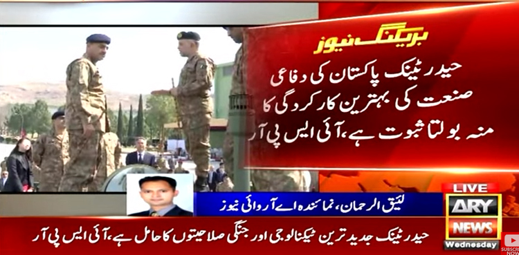آرمی چیف جنرل سید عاصم منیر کو حیدر ٹینک کی تکنیکی صلاحیتوں سمیت مقامی تیار کردہ اسلحے اور ہتھیاروں میں پیش رفت کے بارے میں تفصیلات سے بھی آگاہ کیا گیا۔