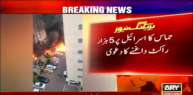 حماس نے دعویٰ کیا ہے کہ ان کی جانب سے اسرائیل پر 5 ہزار راکٹ داغنے گئے ہیں، جس میں 5 افراد ہلاک اور 15 زخمی ہو گئے ہیں، سوشل میڈیا پر آنے والی تصاویر میں سے معلوم ہوتا ہے کہ کئی کاروں کو آگ لگی اور کچھ عمارتوں کو نقصان پہنچا۔