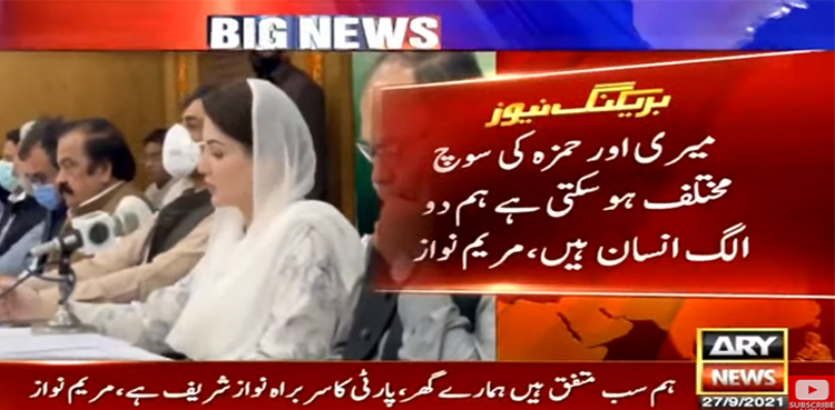 مریم نواز نے کہا کہ میری اور حمزہ کی سوچ مختلف ہوسکتی ہے ہم دو الگ انسان ہیں پارٹی کےاندر بھی مختلف طرح کی سوچ اور آرا ہوتی ہے لیکن ہم سب متفق ہیں کہ ہمارےگھر،پارٹی کاسربراہ نوازشریف ہے۔