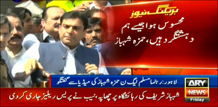 تفصیلات کے مطابق نیب ٹیم کے جانے کے بعد اپوزیشن لیڈر پنجاب اسمبلی حمزہ شہباز نے گھر کے باہر میڈیا سےگفتگو کرتے ہوئے کہاقوم نے دیکھا چادر اور چار دیواری کاتقدس پامال کیاگیا، لاکھوں ووٹ لیکر آئے ،اللہ کی مہربانی سے، ہم سے پہلے انسان ، پاکستانی ہیں، محسوس ہوا جیسے ہم دہشت گردہیں، جیسے دہشت گردوں کے خلاف کارروائی کی جاتی ہے آج ویسے کیاگیا۔