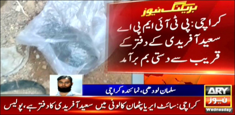 اے آر وائی نیوز کی رپورٹ کے مطابق کراچی کے علاقے سائٹ ایریا میں واقع پٹھان کالونی میں تحریک انصاف کے رکن سندھ اسمبلی سعید آفریدی کے دفتر کے قریب سے دستی بم برآمد ہوا۔