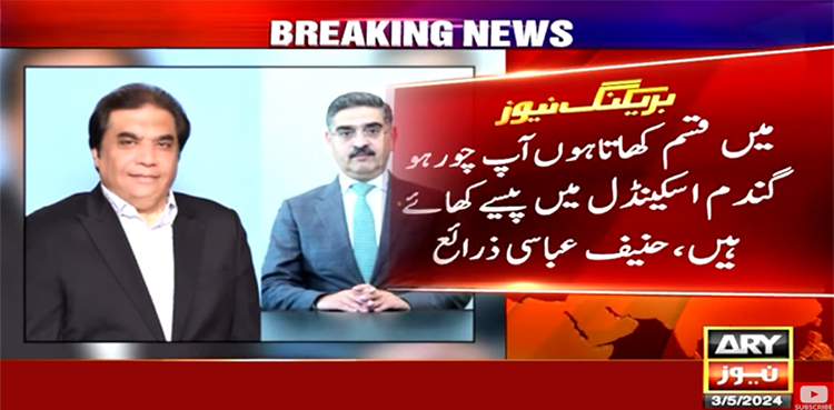 انوارالحق نے حنیف عباسی سے کہا کہ گندم معاملے پر آپ نے ہم پر انگلی اٹھائی ہے کیا گرفتار کرنے آئے ہیں؟ جس پر حنیف عباسی نے کہا کہ میں قسم کھاتا ہوں آپ چور ہو اور گندم اسکینڈل میں پیسےکھائےہیں۔