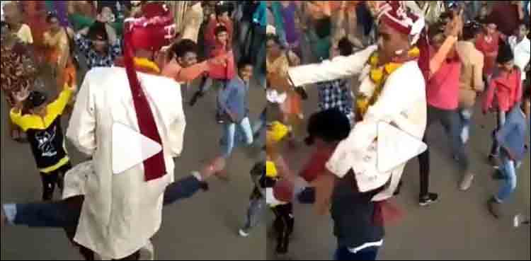 ایسی ہی ایک ویڈیو بھارت سے وائرل ہوئی ہے جس میں دلہے کا دوست نوشے کو اپنے کندھے پر بٹھاکر رقص کررہا ہے اور باقی باراتی بھی اس کے پیچھے رقص کرتے ہوئے چل رہے ہیں۔