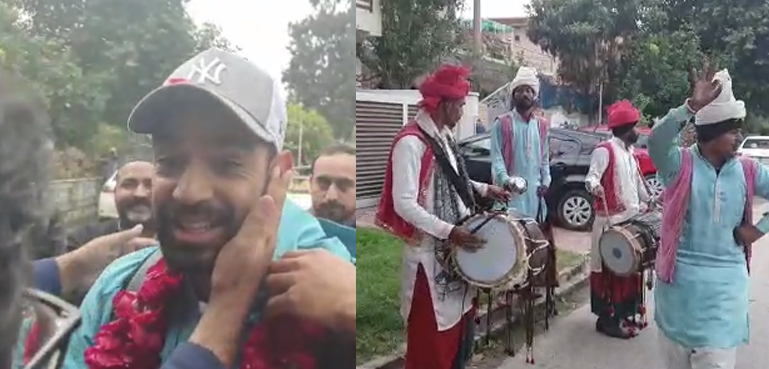 آسٹریلیا میں ٹی ٹوئنٹی ورلڈ کپ میں شرکت کے بعد فاسٹ بولر حارث رؤف کا گھر پہنچنے پر دوست احباب نے ڈھول کی تھاپ پر رقص کرکے استقبال کیا۔