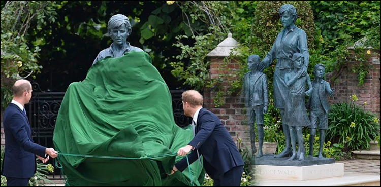 ہیری مجسمے کی نقب کشائی کی تقریب میں شرکت کے لیے کیلی فورنیا سے خصوصی طور پر لندن پہنچے، آج ولیم اور ہیری نے نصب مجسمے پر پڑا کپڑا ہٹا کر اس کی نقاب کشائی کی۔