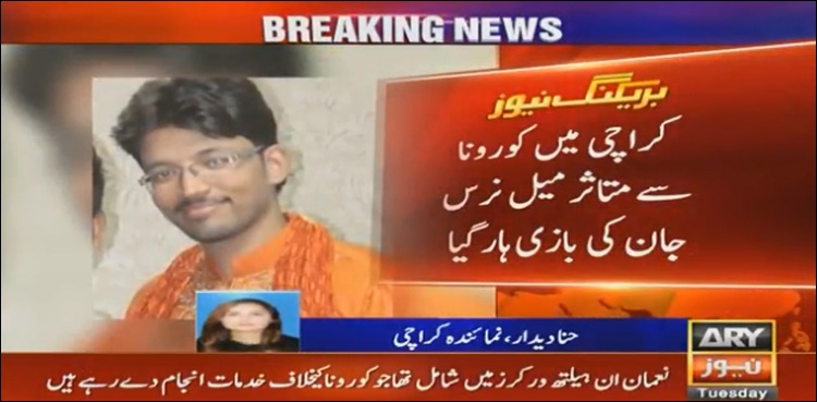 اے آر وائی نیوز کی رپورٹ کے مطابق کرونا وائرس میں مبتلا نرس جان کی بازی ہار گیا، نعمان کی عمر تیس سال تھی، وہ کرونا وائرس کا شکار تھے اور انتہائی نگہداشت وارڈ میں زیرعلاج تھے۔