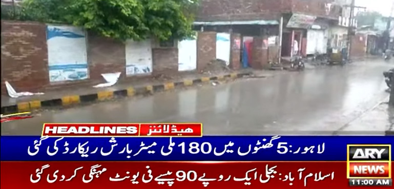 اے آر وائی نیوز کے مطابق لاہور میں رات سے موسلا دھار بارش جاری ہے جس نے شہر کو جل تھل کردیا ہے، نشتر ٹاؤن میں 180، لکشمی چوک میں 178ملی میٹر بارش ریکارڈ کی گئی، قرطبہ چوک میں177، تاج پورہ میں162، جوہر ٹاؤن میں 155 اور اقبال ٹاؤن میں 138ملی میٹر بارش ہوئی۔
