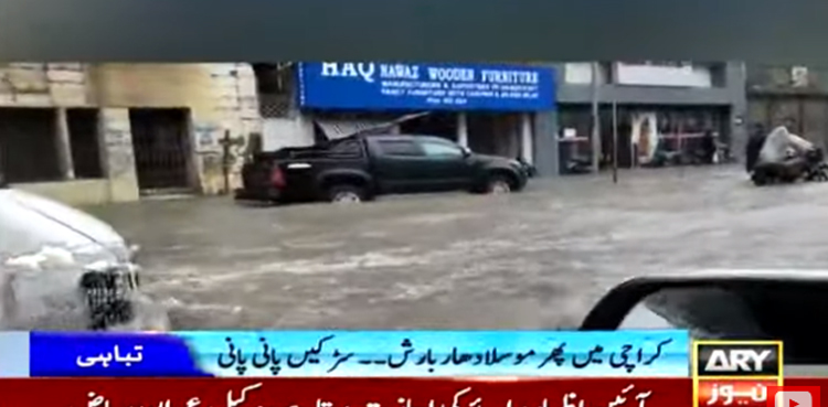 کراچی : شہر قائد میں مون سون کے ایک اور دھواں دھارا سپیل سے گلیاں اور محلے تالاب بن گئے اور سڑکیں ندی نالوں میں تبدیل ہوگئیں جبکہ انڈرپاس میں بھی پانی بھرگیا۔