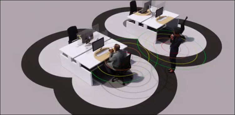 دفاتر کے اس نئے ڈیزائن میں میزوں کے گرد ایریا کو خالی رکھنے کے لیے 6 فٹ کے سماجی فاصلے کے تصور کو استعمال کیا گیا ہے، اس کے لیے ویڈیو میں بنیادی تصورات سے کام لیا گیا ہے، جیسا کہ رنگین کارپٹ کا دائرہ لگایا گیا ہے۔