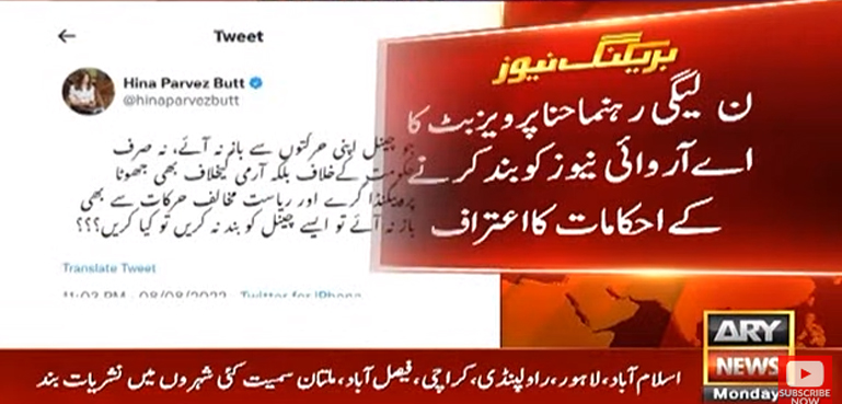 مسلم لیگ ن کی رہنما حنا پرویز بٹ نے سماجی رابطوں کی ویب سائٹ ٹوئٹر پر اے آر وائی نیوز کی نشریات بند کرنے کے احکامات کا اعتراف کرلیا ہے۔