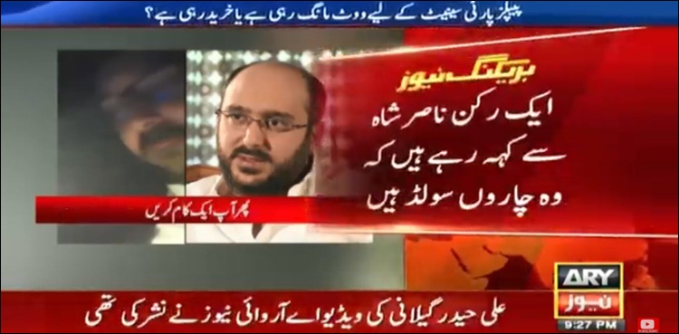 اے آر وائی نیوز کے مطابق سینیٹ الیکشن کے سلسلے میں اراکین اسمبلی کی خرید و فروخت عروج پر ہے، اب ایک آڈیو بھی سامنے آ گئی ہے جس میں علی حیدر گیلانی نے ٹیلی فون پر تحریک انصاف کے اراکین قومی اسمبلی سے وزیر اطلاعات سندھ ناصر حسین شاہ کی بات کروائی۔