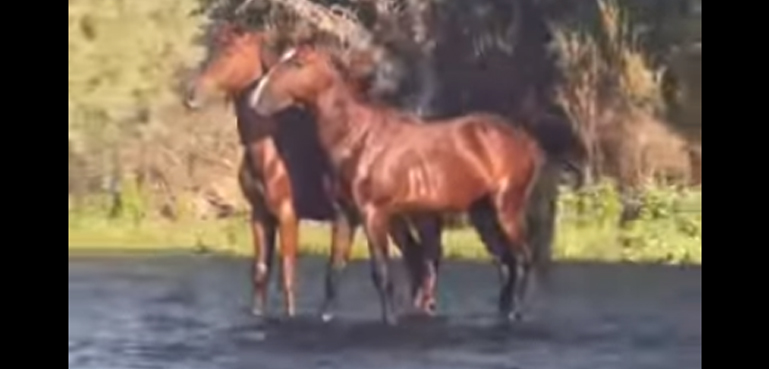 یہ دلچسپ ویڈیو کیلی راجرر نامی خاتون نے اس وقت بنائی جب وہ اپنے پوتے اور پوتیوں کے ہمراہ ٹونٹو نیشنل فاریسٹ ایریزونا میں دریائے سالٹ پر پیڈل بورڈنگ کر رہی تھیں۔ دریا سے باہر آتے وقت انہوں نے دیکھا کہ دریا کے دوسرے کنارے کے قریب دو گھوڑے موجود تھے انہوں نے فوراً اپنا فون نکالا اور اس دلکش منظر کو اپنے موبائل کے کیمرے میں قید کرلیا۔