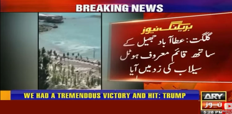 ضلعی انتظامیہ کا کہنا ہے کہ عطا آباد جھیل کے ساتھ قائم ہوٹل سیلاب کی زد میں آگیا جس کے بعد ہوٹل سے سیاحوں کو محفوظ مقام پر منتقل کردیا گیا ہے۔