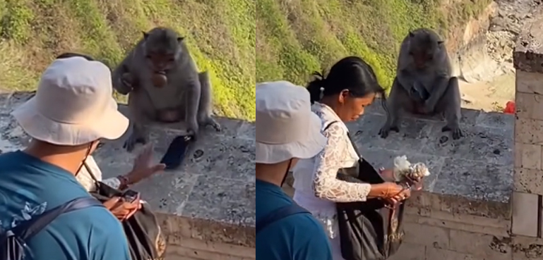 پہلے خاتون بندر کو پھل کا ایک ٹکڑا پیش کرتی ہیں جو وہ فوراً جھپٹ لیتا ہے تاہم فون واپس نہیں کرتا جس کے بعد متاثرہ خاتون پھر اپنے پرس کو کھنگالتی ہیں اور اس میں موجود دوسرا پھل بھی اس کو دے دیتی ہیں جس کے بعد وہ رشوت خور بندر انہیں موبائل فون واپس کرکے اپنی راہ لیتا ہے۔