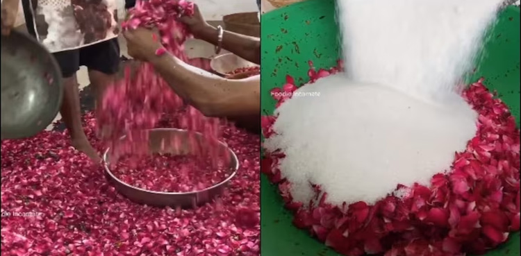 ویڈیو میں دیکھا جاسکتا ہے کہ گلاب کی پنکھڑیوں کو کس طرح احتیاط سے الگ کیا جاتا ہے، اس کے بعد، پنکھڑیوں کو ایک بڑے ٹب میں چینی کے ساتھ ملایا جاتا ہے، اس بات کو یقینی بنایا جاتا ہے کہ چینی اور پتیوں کا ذائقہ ایک دوسرے میں مل جائے۔