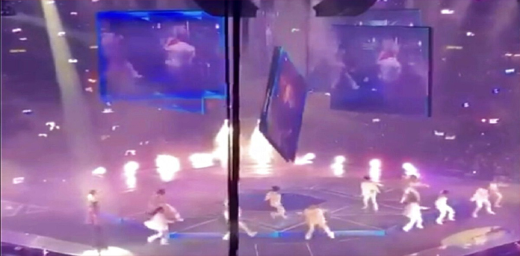 سوشل میڈیا پر گردش کرنے والی ویڈیو میں دیکھا جا سکتا ہے کہ کنسرٹ کے دوران اسٹیج پر ڈانسر پرفام کر رہے ہیں اور اسی دوران بڑی اسکرین ان پر آ گرتی ہے۔