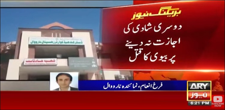 نمائندہ اے آر وائی نیوز فرخ انعام کے مطابق نارووال کے تھانہ رعیہ خاص کی حدود میں واقعہ نواحی گاؤں میں محمد عظیم نامی شخص نے اپنی بیوی کو قتل کردیا۔ مقتولہ صوبیہ کی 6 سال قبل عظیم سے شادی ہوئی جس کے بعد اُن کے ہاں تین بیٹوں کی پیدائش ہوئی۔