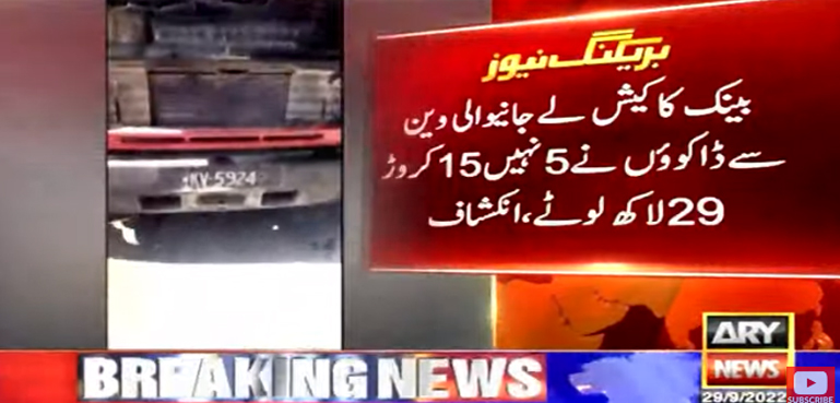 حیدرآباد میں گزشتہ روز نجی بینک کی کیش وین سے مسلح ڈاکوؤں کے 15 کروڑ 29 لاکھ روپے لوٹنے کا انکشاف ہوا ہے پولیس نے مقدمہ درج کرلیا ہے۔