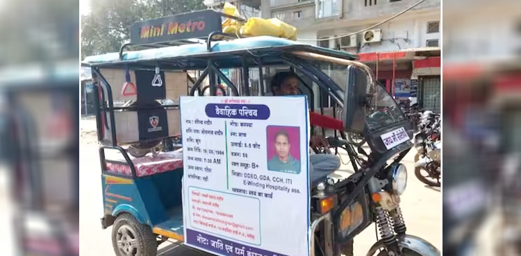 بھارتی ریاست مدھیہ پردیش سے تعلق رکھنے والے 29 سالہ شخص نے رکشہ پر ہورڈنگ لگاکر دلہن کی تلاش شروع کردی ہے۔ ہورڈنگ پر اس شخص نے ذاتی تفصیلات جیسے قد، تاریخ پیدائش، اور دیگر چیزیں لکھی ہیں۔