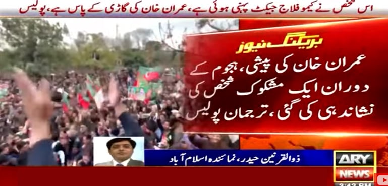 پاکستان تحریک انصاف کے چیئرمین عمران خان کی عدالت میں پیشی کے دوران ہجوم میں ایک مشکوک شخص کی نشاندہی کی گئی ہے۔