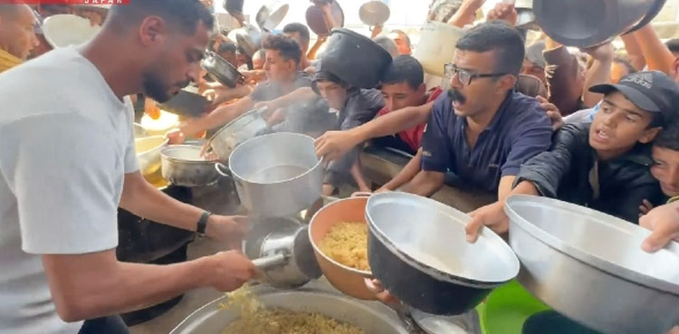 غزہ میں امدادی گروپ کی جانب سے کھانا تقسیم کیا گیا جہاں گروپ نے چاول کی تقریباً 20 دیگیں پکائیں۔