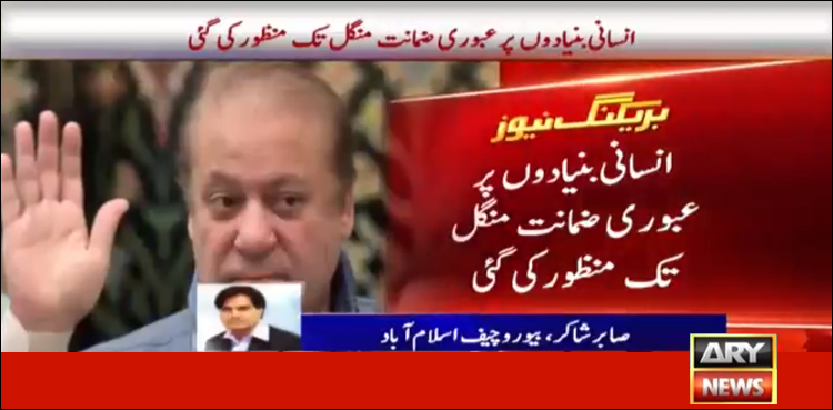 اسلام آباد: ہائی کورٹ نے العزیزیہ کیس میں سابق وزیر اعظم میاں نواز شریف کی طبی بنیادوں پر عبوری ضمانت منظور کر لی، عدالت کا کہنا ہے کہ انسانی بنیادوں پر منگل تک سزا معطلی اور درخواست ضمانت منظور کی گئی ہے۔