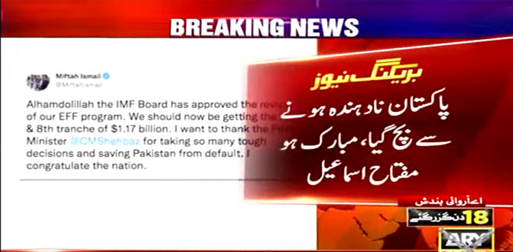 دوسری جانب وزیر خزانہ مفتاح اسماعیل نے بھی آئی ایم ایف پروگرام کی بحالی کی تصدیق کردی ہے، سماجی رابطے کی ویب سائٹ ٹوئٹر پر اپنے بیان میں مفتاح اسماعیل نے کہا کہ قوم کو مبارک ہو پاکستان نادہندہ ہونے سے بچ گیا ہے۔
